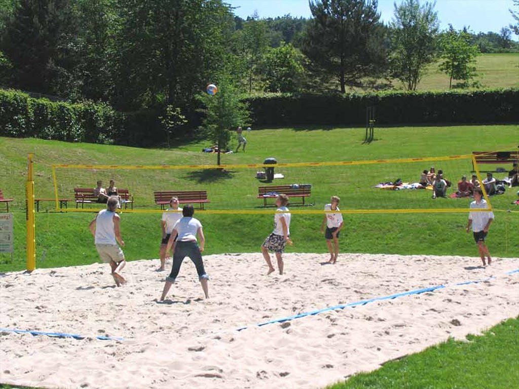 wie „Beachvolleyball-Platz“ und den Spielgeräten im Kleinkinderbereich lockt