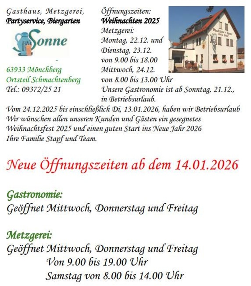 Leider haben wir keine Gästezimmer. Wir können Ihnen aber sehr gute Unterkünfte in Schmachtenberg, Mönchberg und Umgebung empfehlen. In unserer hauseigenen Metzgerei (seit 1876) stellen wir nach über vielen Jahre überlieferten Rezepturen feinste Spezialitäten und zünftige Hausmannskost wie Schwartenmagen, Presssack u.a., her (mehr Info hier klicken). Bekannt gut bürgerliche Küche. Schöner Biergarten. Sitzplätze / Personen Gastraum: 60 Biergarten: 50 Öffnungszeiten: Di bis Fr 09.00 bis 22.00 Uhr Samstag 08.00 bis 22.00 Uhr Sonntag 11.00 bis 22.00 Uhr Montag Ruhetag. Bitte besuchen Sie uns auch auf unsere Homepage: https://zur-sonne.spessartland.de Zum Routenplaner (Google) Gasthaus Metzgerei "Zur Sonne" OT Schmachtenberg 63933 Mönchberg Telefon:0 93 72 / 25 21 e-mail: stapf-gasthaus-sonne@web.de (wird nicht ständig abgerufen!) Seien Sie unser Gast und lassen Sie sich herzlich bewirten. Ihre Familie Stapf Anschließend automatische Slidershow nach 3 Sekunden. stop |