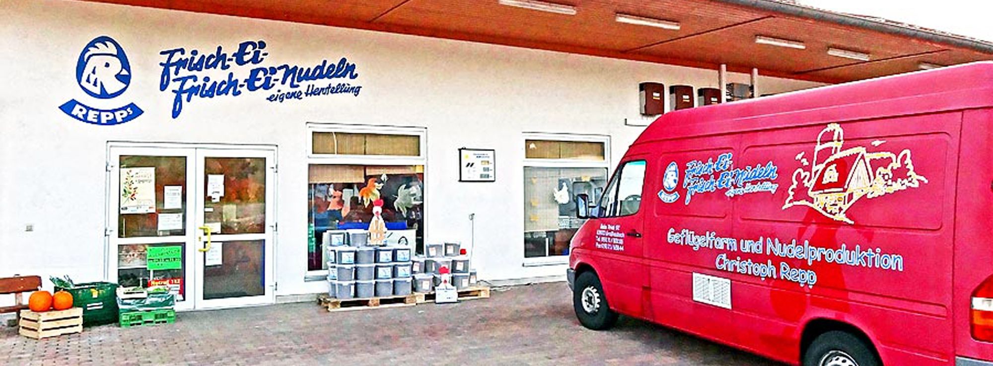 direkt aus der Region. Gerne können Sie Pate für ein Huhn werden. Sollten Sie daran Interesse haben, bitte kontaktieren Sie uns in unserem Hofladen. Eierfärberei Eier Wir betreiben einen Groß- und Einzelhandel für Eier in jeder Haltungsform und Güteklasse. Die Abnahme ist in großen und kleinen Mengen möglich.Seit 2005 vertreiben wir auch Flüssigvollei, Flüssigeigelb, Eiweiß und gekochte Eier vacuumiert. Unsere Koch- und Färbeanlage für bunte Eier läuft für das Ostergeschäft ab Dezember bis Ostern täglich und anschließend einmal wöchentlich. Auch hier arbeiten wir zum größten Teil per Hand, so dass durchwegs eine sorgfältige Qualitätskontrolle stattfindet. Besuchen Sie unseren Hofladen in Großheubach. Es lohnt sich! Tag der offenen Tür am Palmsonntag Jedes Jahr am Palmsonntag feiern wir unser Hofladenfest von 11.00 Uhr bis 17.00 Uhr. Besuchen Sie uns und lassen Sie sich mit Kaffee und Kuchen bewirten. Bei uns können Sie außerdem dem Osterhasen beim Kochen und Färben von 3000 Eiern in der Stunde über die Schulter schauen. Wir freuen uns auf Sie und begrüßen Sie gerne bei uns am Palmsonntag. Besichtigung der Ostereierwerkstatt Ab sofort ist die Ostereierwerktstatt zur Besichtigung für Besucher geöffnet. Größere Gruppen bitte anmelden. Zur Anmeldung. Unsere Öffnungszeiten: Mo. - Fr.: 8.00 Uhr - 18.00 Uhr Samstag: 8.00 Uhr - 13.00 Uhr Wir begrüßen Sie gerne bei uns im Hofladen! Geflügelfarm Christoph Repp Auweg 25 63920 Großheubach / Main Telefon: 09371 / 80286 Fax: 09371 / 65844 E-Mail: repp-grossheubach@t-online.de Internet: https://www.repps-frischeinudeln.de Adresse der spessartland-Seite: www.spessartland.de/ repp.shtml Zum Routenplaner (Google) |