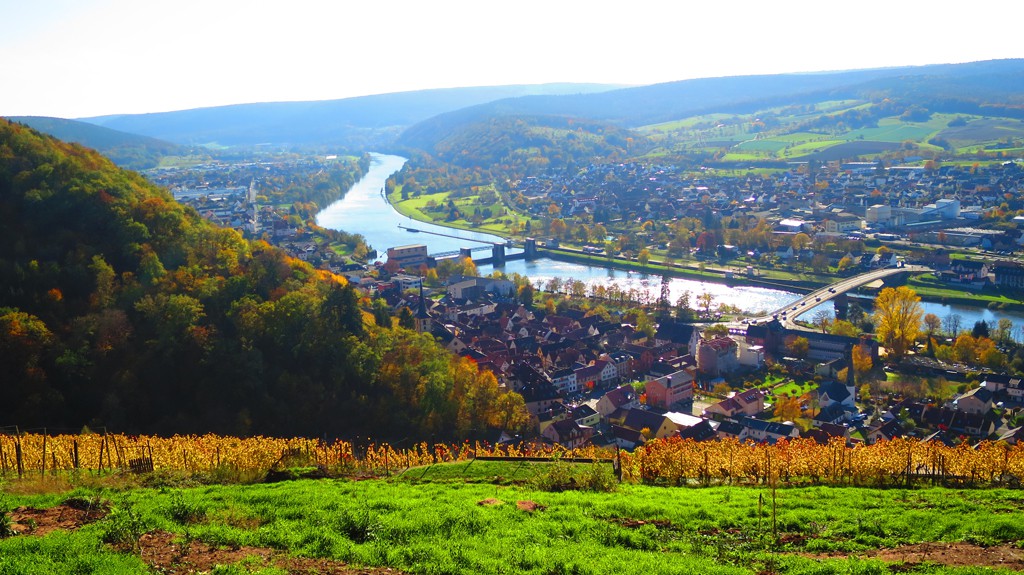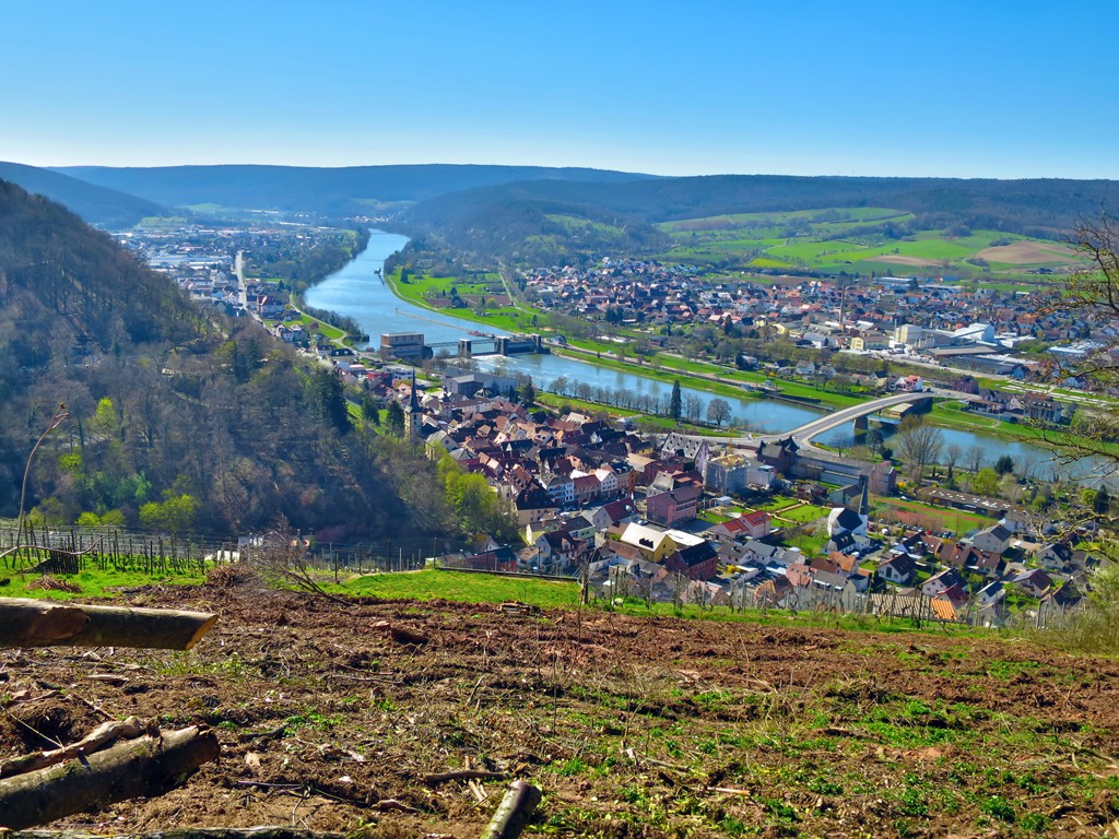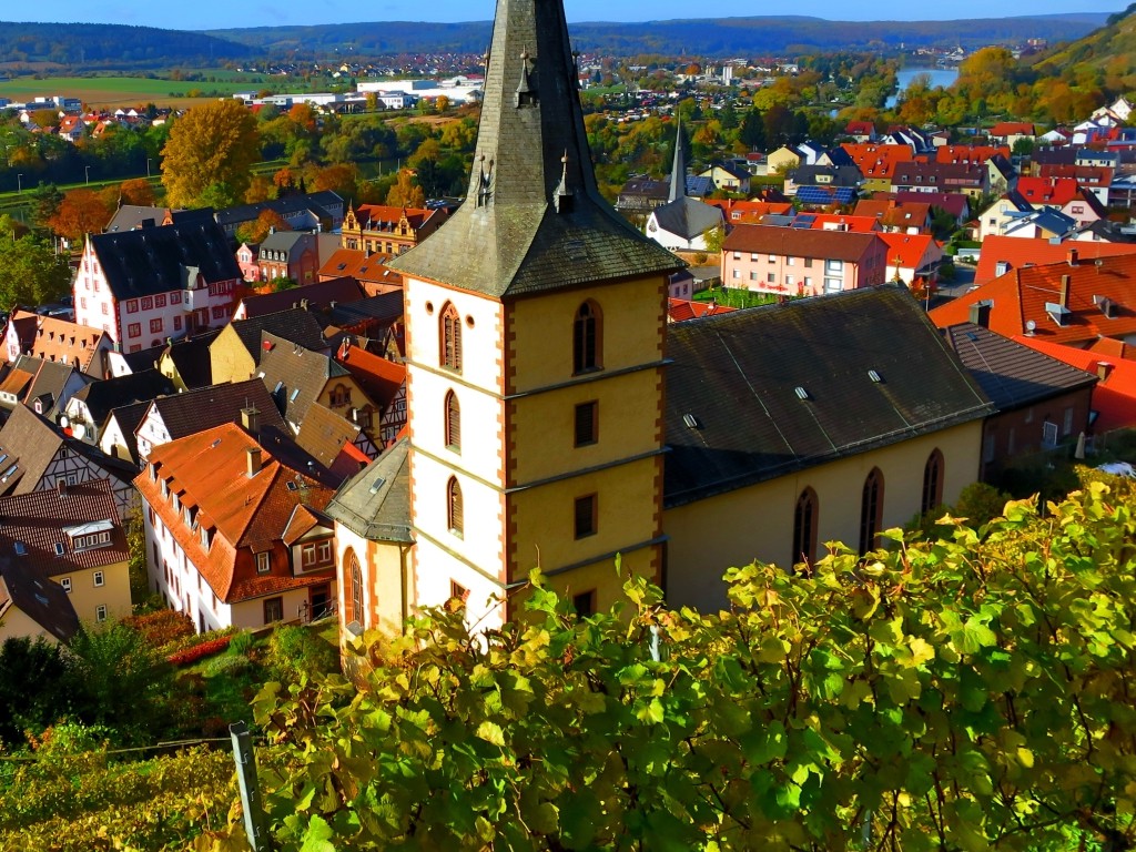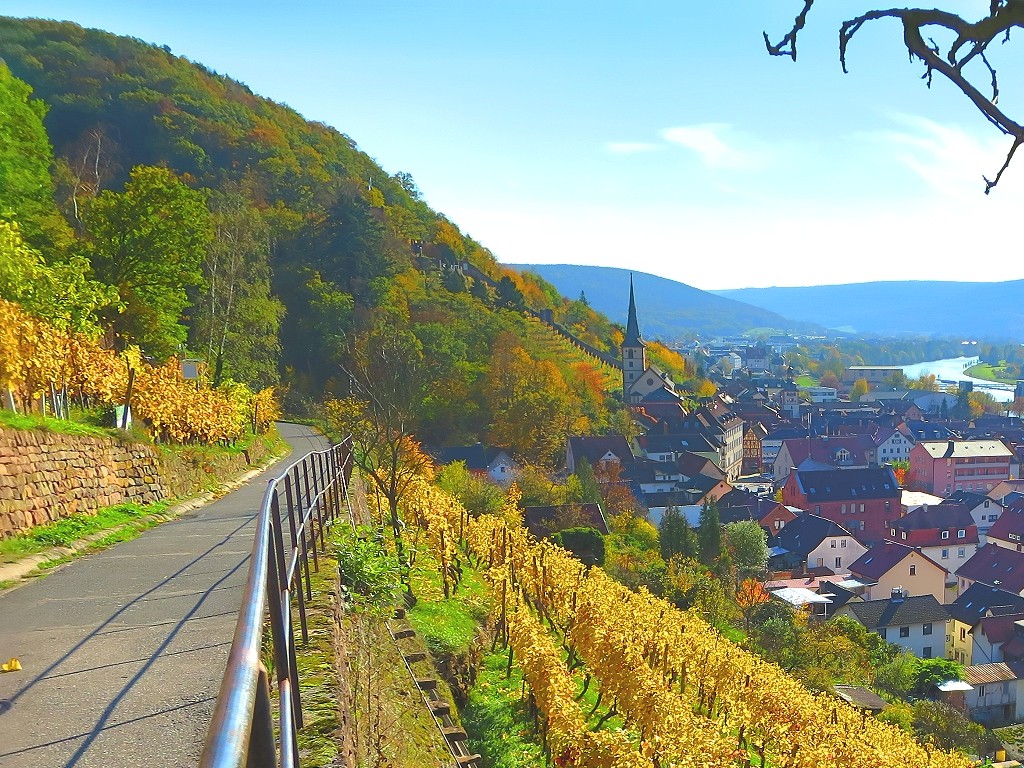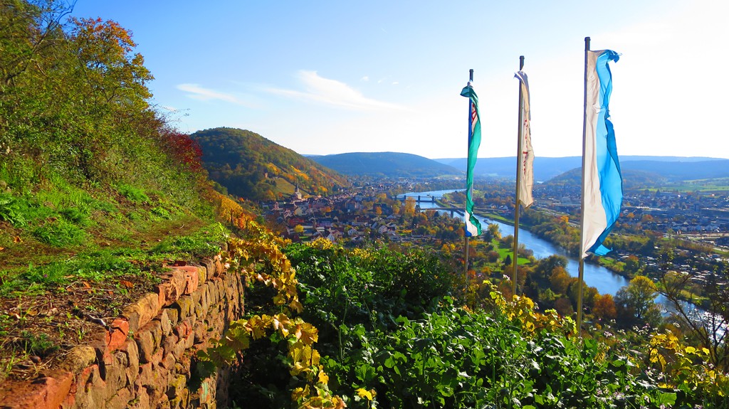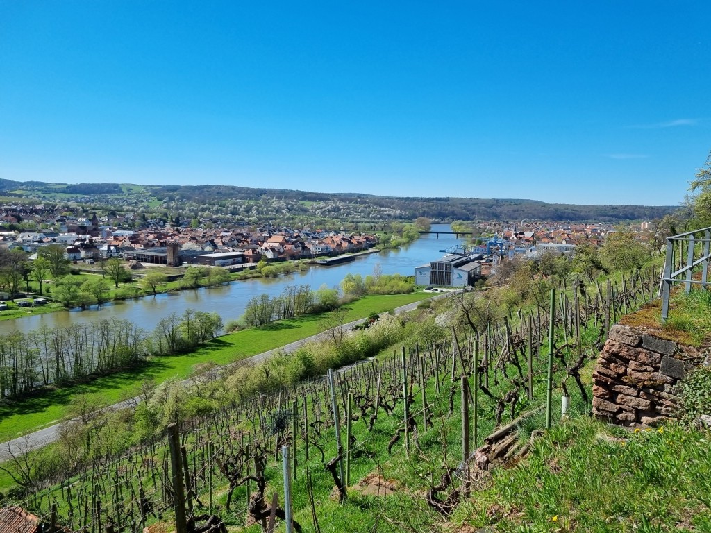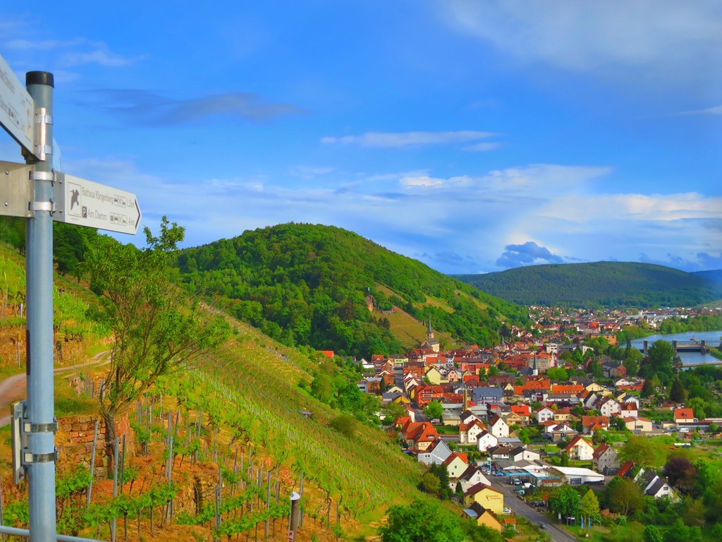An einer kleinen Grünanlage mit einigen Sitzbänken biegen wir nach links in die Mechenharder Straße ab. Wir überqueren eine Fußgängerampel und gehen auf der anderen Straßenseite rechts der Mechenharder Straße hinauf zum Erlenbacher Schwimmbad. Ein stets aktueller Hinweis informiert hier über die jeweilige Häckerwirtschaft. Bald nach dem Schwimmbad wandern wir nach rechts bis auf der linken Seite eine Treppe erscheint. Sie führt uns zu einem Pavillon, von dem aus wir einen schönen Blick auf Erlenbach und das gegenüber liegende Wörth haben. Nach dem Pavillon führen uns Treppenstufen weiter bergauf bis zu einem Wirtschaftsweg, dem wir nach rechts folgen. Wir passieren das Hohbergkreuz und laufen am Hang entlang hoch über dem Main. Von der Picknickplattform und den Aussichtspunkten terroir f Churfranken haben wir einen tollen Blick auf Wörth, die Schiffswerft von Erlenbach und auch auf Klingenberg. Mit dem Blick Richtung Wörth sehen Sie die Wörther Weinberge. (Wörth bietet eine schön hergerichtete Altstadt, ein Schifffahrts- und Heimatmuseum und ist somit immer einen Abstecher wert.) Während sich zu unserer Linken Wald befindet, ist die rechte, steil bergab fallende Seite des Hanges mit den sonnenverwöhnten Weinterrassen, des Erlenbacher Hochbergs bedeckt. Bald erstrecken sich die Weinberge auch zu unserer Linken. In den denkmalgeschützten Buntsandstein-Terrassen des Klingenberger Schlossberges finden sich seltene Farne, Blumen und Kräuter. Vorbei am Schutzpatron der Winzer St. Urban erreichen wir nach einer Weile auf der Hohbergstraße den Ortsrand von Klingenberg. Am Ende der Straße führt uns die Bergwerkstraße nach rechts hinunter in Richtung Ortsmitte. Im Tal biegen wir nach links auf die Rathausstraße ab und folgen ihr bis zu einm Rechtsknick. Hier gehen wir geradeaus auf der verkehrsberuhigten Hauptstraße in die Altstadt von Klingenberg. Ein Rundgang durch die historischen Gassen lohnt sich allemal. Am Ende der Hauptstraße befindet sich das Stadttor.