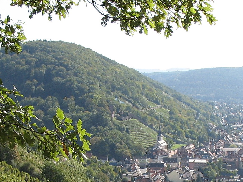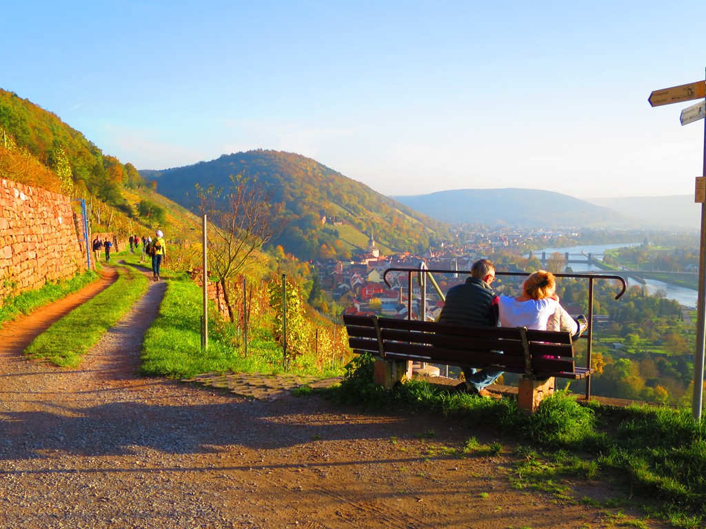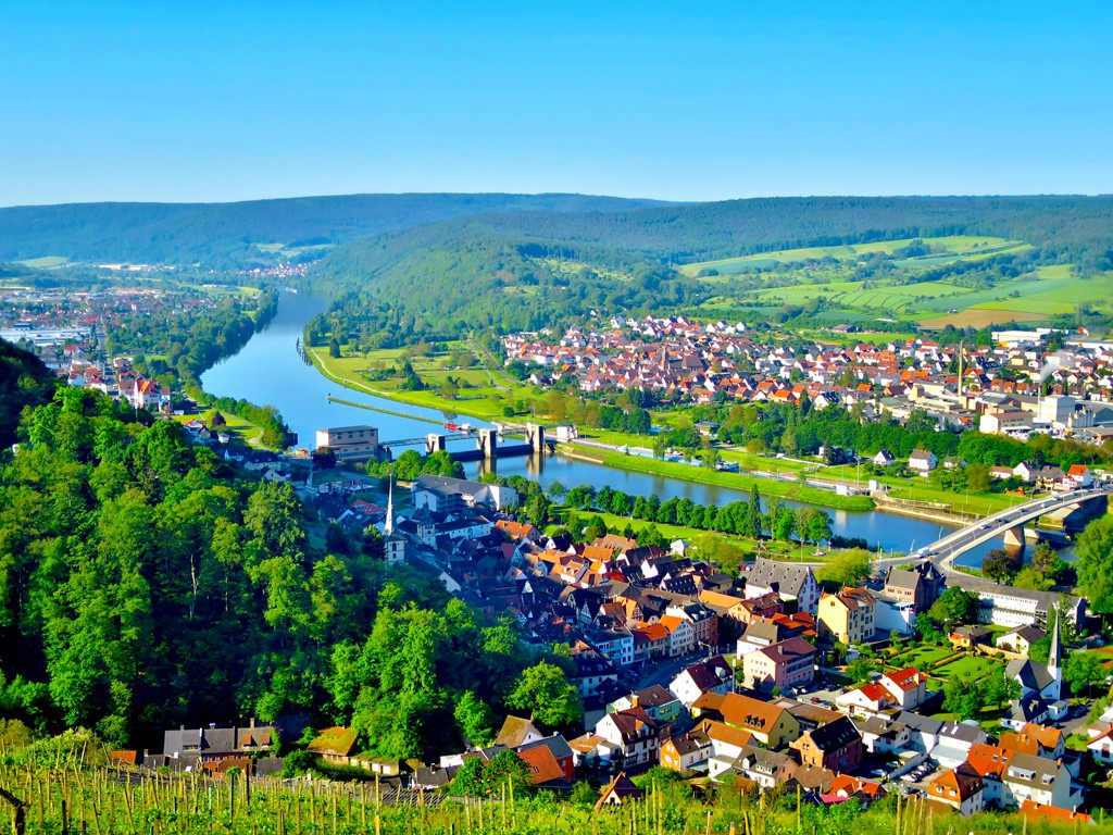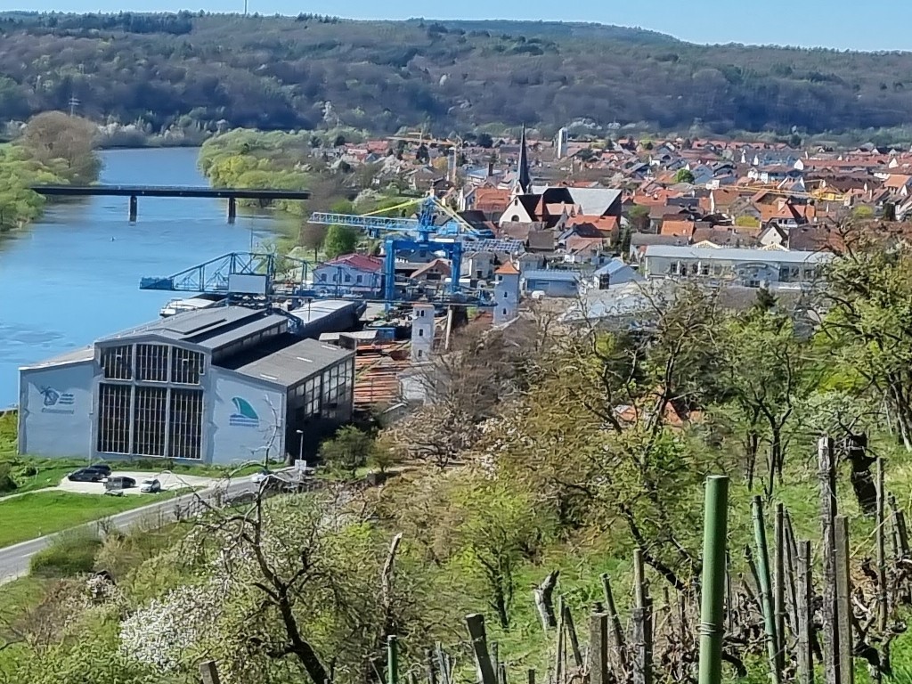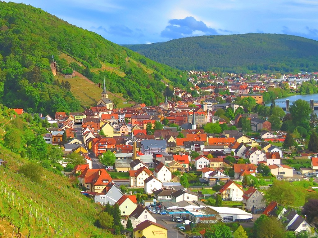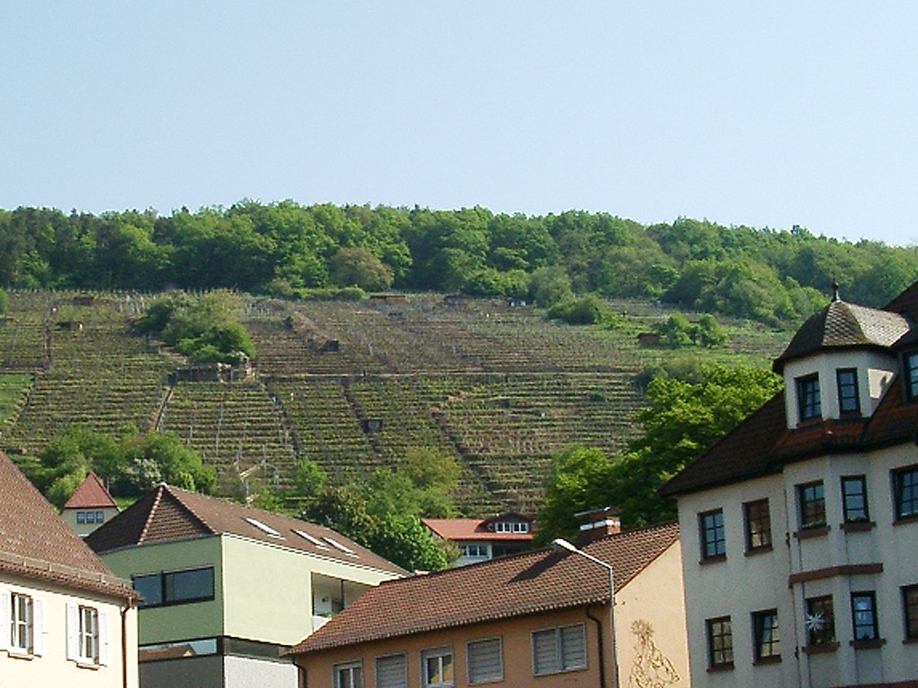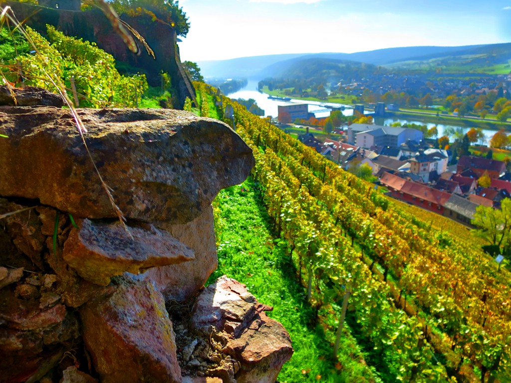 An einer kleinen Grünanlage mit einigen Sitzbänken biegen wir nach links in die Mechenharder Straße ab. Wir überqueren eine Fußgängerampel und gehen auf der anderen Straßenseite rechts der Mechenharder Straße hinauf zum Erlenbacher Schwimmbad. Ein stets aktueller Hinweis informiert hier über die jeweilige Häckerwirtschaft. Bald nach dem Schwimmbad wandern wir nach rechts bis auf der linken Seite eine Treppe erscheint. Sie führt uns zu einem Pavillon, von dem aus wir einen schönen Blick auf Erlenbach und das gegenüber liegende Wörth haben. Nach dem Pavillon führen uns Treppenstufen weiter bergauf bis zu einem Wirtschaftsweg, dem wir nach rechts folgen. Wir passieren das Hohbergkreuz und laufen am Hang entlang hoch über dem Main. Von der Picknickplattform und den Aussichtspunkten terroir f Churfranken haben wir einen tollen Blick auf Wörth, die Schiffswerft von Erlenbach und auch auf Klingenberg. Mit dem Blick Richtung Wörth sehen Sie die Wörther Weinberge. (Wörth bietet eine schön hergerichtete Altstadt, ein Schifffahrts- und Heimatmuseum und ist somit immer einen Abstecher wert.) Während sich zu unserer Linken Wald befindet, ist die rechte, steil bergab fallende Seite des Hanges mit den sonnenverwöhnten Weinterrassen, des Erlenbacher Hochbergs bedeckt. Bald erstrecken sich die Weinberge auch zu unserer Linken. In den denkmalgeschützten Buntsandstein-Terrassen des Klingenberger Schlossberges finden sich seltene Farne, Blumen und Kräuter. Vorbei am Schutzpatron der Winzer St. Urban erreichen wir nach einer Weile auf der Hohbergstraße den Ortsrand von Klingenberg. Am Ende der Straße führt uns die Bergwerkstraße nach rechts hinunter in Richtung Ortsmitte. Im Tal biegen wir nach links auf die Rathausstraße ab und folgen ihr bis zu einm Rechtsknick. Hier gehen wir geradeaus auf der verkehrsberuhigten Hauptstraße in die Altstadt von Klingenberg. Ein Rundgang durch die historischen Gassen lohnt sich allemal. Am Ende der Hauptstraße befindet sich das Stadttor.
