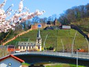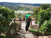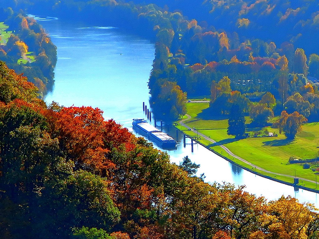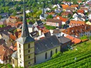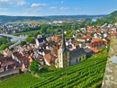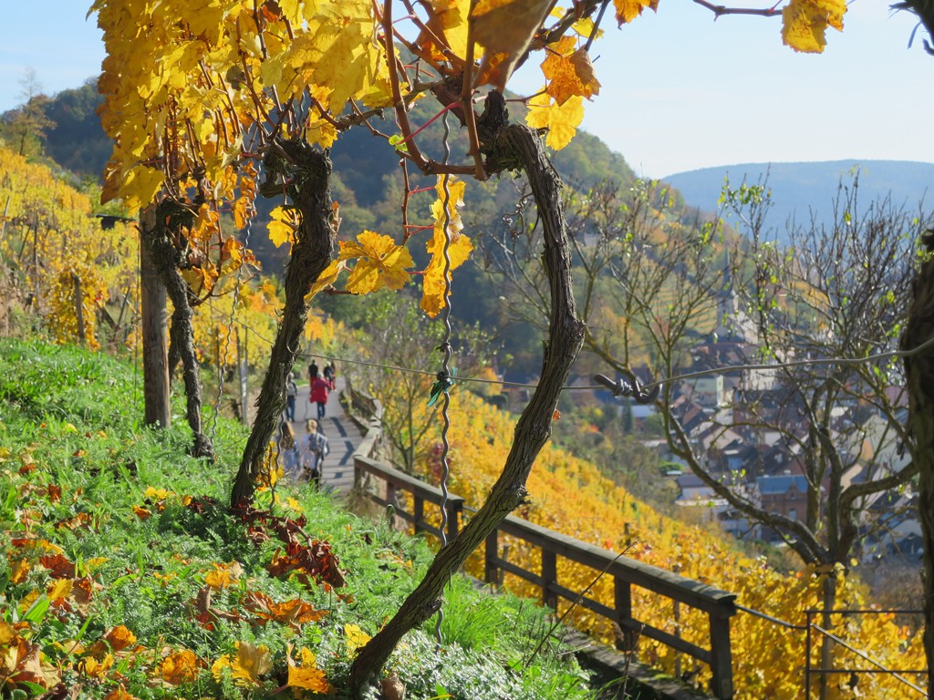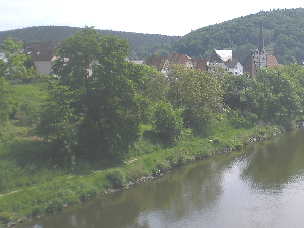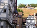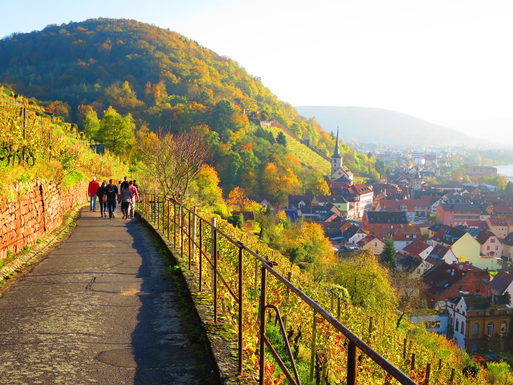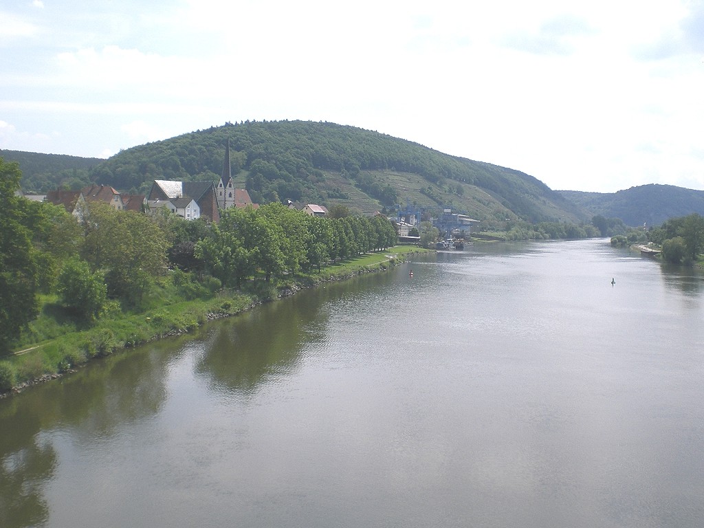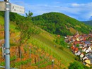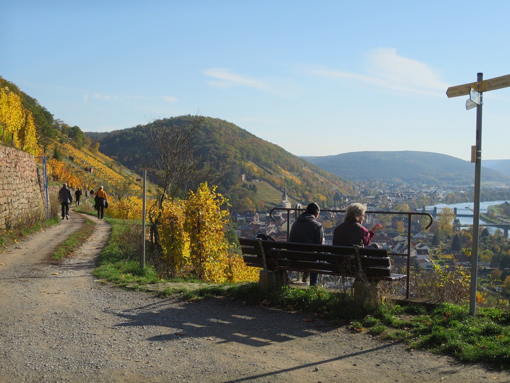 An einer kleinen Grünanlage mit einigen Sitzbänken biegen wir nach links in die Mechenharder Straße ab. Wir überqueren eine Fußgängerampel und gehen auf der anderen Straßenseite rechts der Mechenharder Straße hinauf zum Erlenbacher Schwimmbad. Ein stets aktueller Hinweis informiert hier über die jeweilige Häckerwirtschaft. Bald nach dem Schwimmbad wandern wir nach rechts bis auf der linken Seite eine Treppe erscheint. Sie führt uns zu einem Pavillon, von dem aus wir einen schönen Blick auf Erlenbach und das gegenüber liegende Wörth haben. Nach dem Pavillon führen uns Treppenstufen weiter bergauf bis zu einem Wirtschaftsweg, dem wir nach rechts folgen. Wir passieren das Hohbergkreuz und laufen am Hang entlang hoch über dem Main. Von der Picknickplattform und den Aussichtspunkten terroir f Churfranken haben wir einen tollen Blick auf Wörth, die Schiffswerft von Erlenbach und auch auf Klingenberg. Mit dem Blick Richtung Wörth sehen Sie die Wörther Weinberge. (Wörth bietet eine schön hergerichtete Altstadt, ein Schifffahrts- und Heimatmuseum und ist somit immer einen Abstecher wert.) Während sich zu unserer Linken Wald befindet, ist die rechte, steil bergab fallende Seite des Hanges mit den sonnenverwöhnten Weinterrassen, des Erlenbacher Hochbergs bedeckt. Bald erstrecken sich die Weinberge auch zu unserer Linken. In den denkmalgeschützten Buntsandstein-Terrassen des Klingenberger Schlossberges finden sich seltene Farne, Blumen und Kräuter. Vorbei am Schutzpatron der Winzer St. Urban erreichen wir nach einer Weile auf der Hohbergstraße den Ortsrand von Klingenberg. Am Ende der Straße führt uns die Bergwerkstraße nach rechts hinunter in Richtung Ortsmitte. Im Tal biegen wir nach links auf die Rathausstraße ab und folgen ihr bis zu einm Rechtsknick. Hier gehen wir geradeaus auf der verkehrsberuhigten Hauptstraße in die Altstadt von Klingenberg. Ein Rundgang durch die historischen Gassen lohnt sich allemal. Am Ende der Hauptstraße befindet sich das Stadttor.