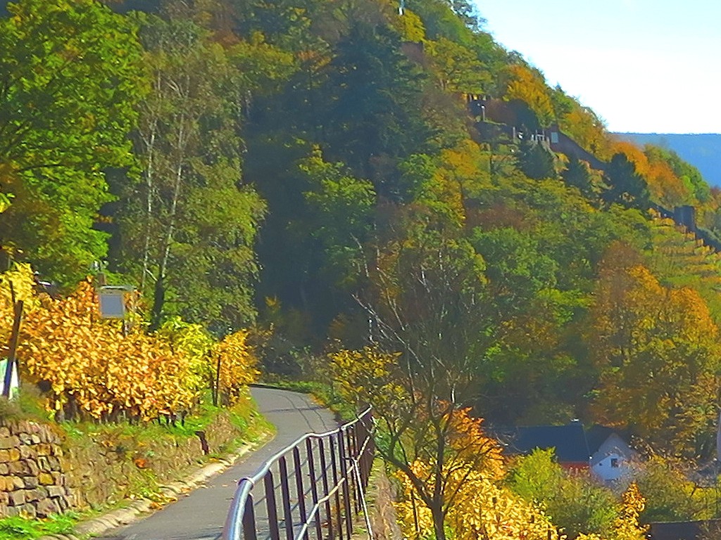 Nicht weit entfernt, beim Heimatmuseum, zweigt auf der linken Seite eine Treppe ab, die uns hinauf zum Burgweg bringt. Diesem folgen wir nach rechts an einige Weinterrassen vorbei bis zum Johannesweg. Eine Wegalternative führt uns am Ortseingang von Klingenberg nicht nach rechts über die Bergwerkstraße bergab ins Zentrum von Klingenberg, sondern einige Meter an der Straße entlang nach links. Auf der rechten Seite zweigt bald die Clingenburgstraße ab, auf der wir über Serpentinen und durch Wald die Ruine der Clingenburg erreichen. Hoch über Klingenberg gelegen, haben wir von hieraus einen herrlichen Ausblick über das Tal. Anschließend führt uns der Burgweg wieder hinab ins Tal zum Johannesweg.